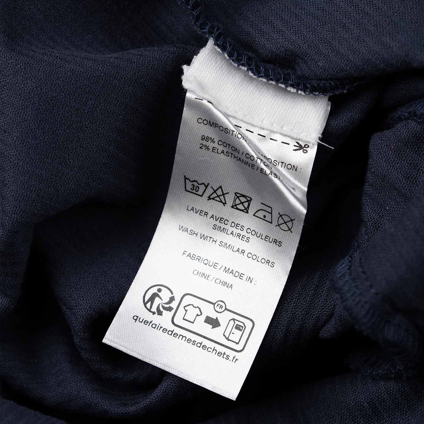 L'étiquette avec la composition et les conseils d'entretien est cousue à l'intérieur, avec une extension de tissus. Aucune gêne possible si découpée !