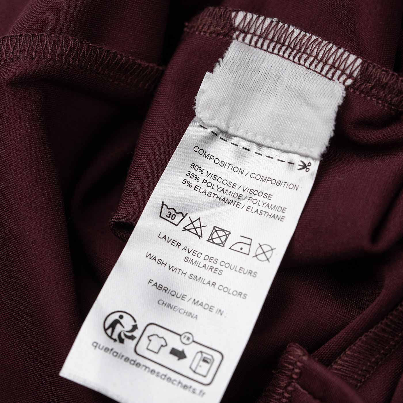L'étiquette avec la composition et les conseils d'entretien est cousue à l'intérieur, avec une extension de tissus. Aucune gêne possible si découpée !